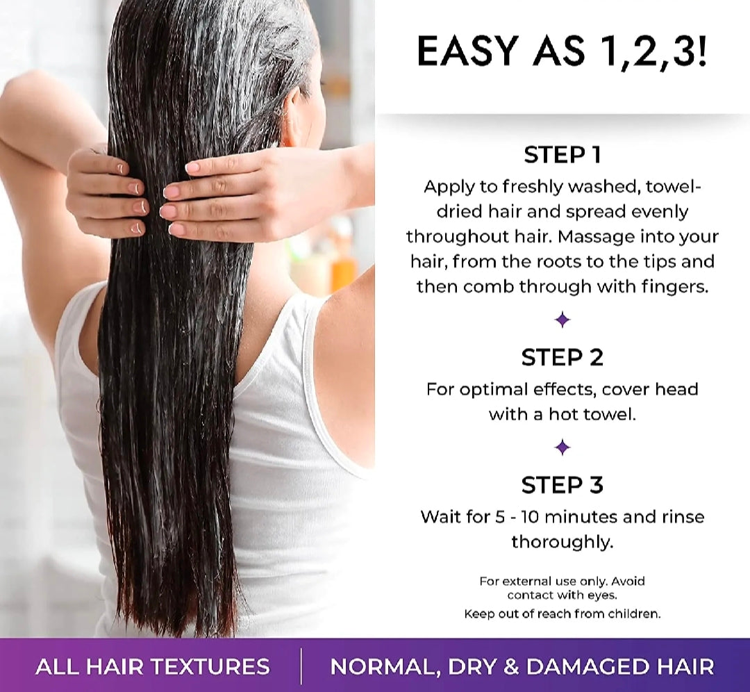 After shampooing, apply evenly on damp hair from mid-lengths to ends. Leave for 10–15 minutes, then rinse thoroughly. Use 1–2 times a week for best results.